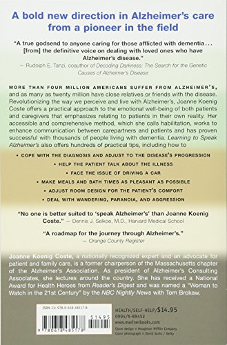 More than four million Americans suffer from Alzheimer’s, and as many as twenty million have close relatives or friends with the disease. Revolutionizing the way we perceive and live with Alzheimer’s, Joanne Koenig Coste offers a practical approach to the emotional well-being of both patients and caregivers that emphasizes relating to patients in their own reality. Her accessible and comprehensive method, which she calls habilitation, works to enhance communication between carepartners and patients and has proven successful with thousands of people living with dementia. Learning to Speak Alzheimer’s also offers hundreds of practical tips, including how to · cope with the diagnosis and adjust to the disease’s progression · help the patient talk about the illness · face the issue of driving · make meals and bath times as pleasant as possible · adjust room design for the patient’s comfort · deal with wandering, paranoia, and aggression
